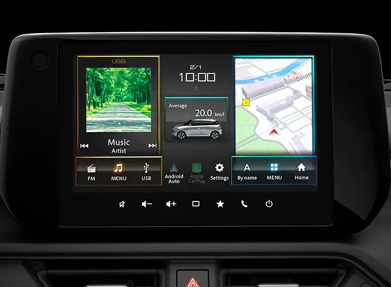 Sistemul audio cu display multimedia de 9 inch este poziționat central, cu afișaj subtil înclinat spre șofer pentru o vizualizare ușoară și operare cu comandă tactilă.